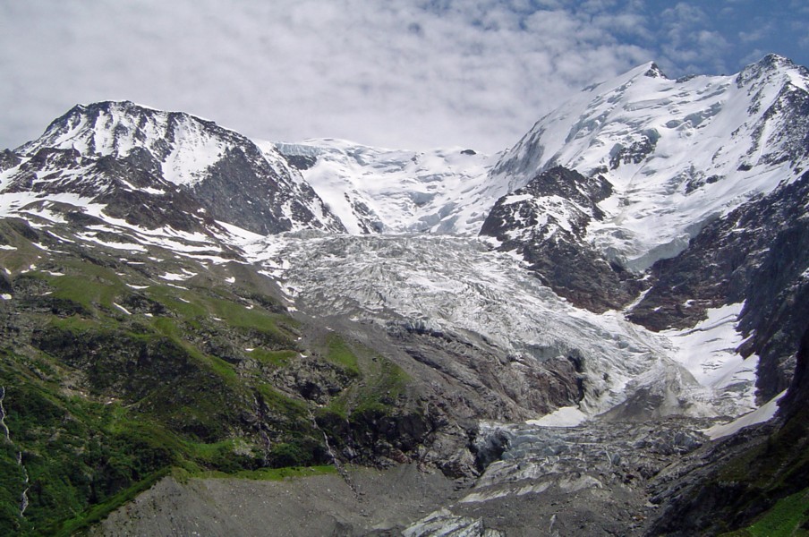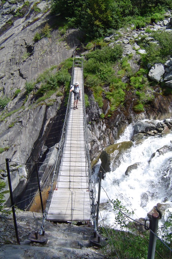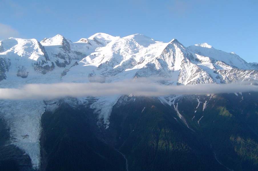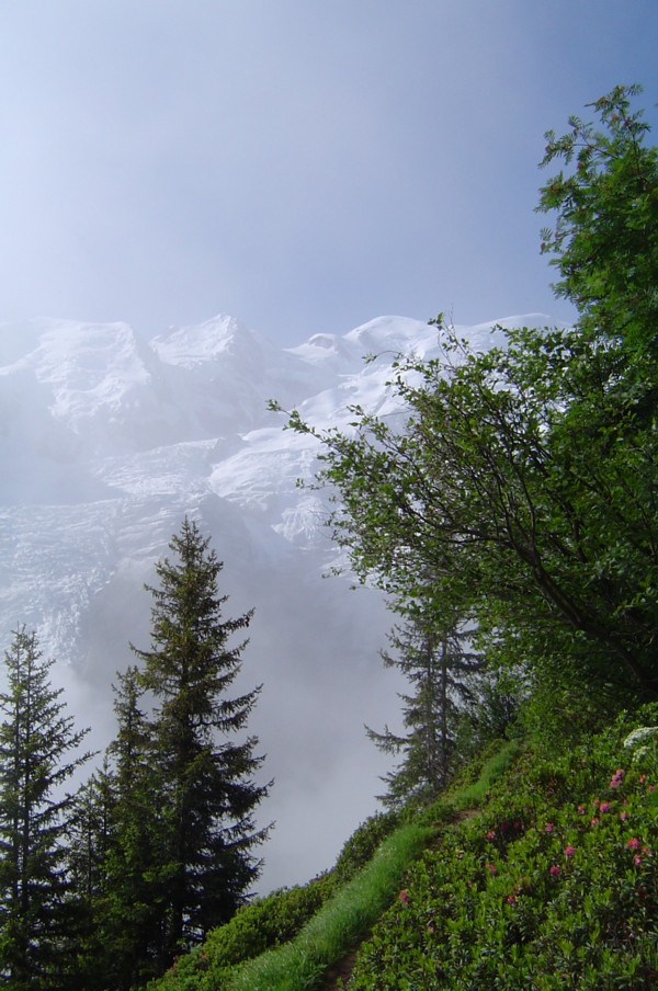 Bottom row L>R - Mont Blanc from Refuge de Bel-Lachat : Mont Blanc through a veil of cloud : crossing Torrent de Bionnassay : Glacier de Bionnassay : chapel at Notre-Dame de la Gorge