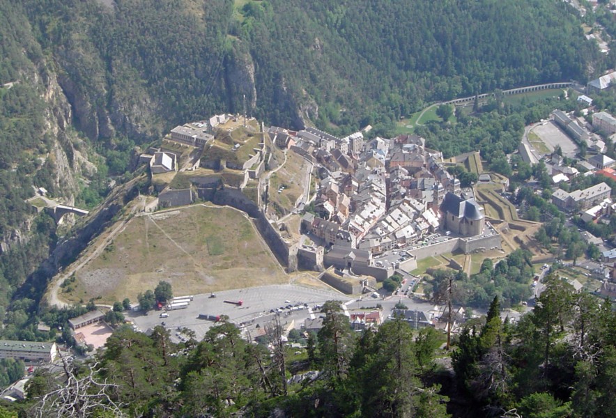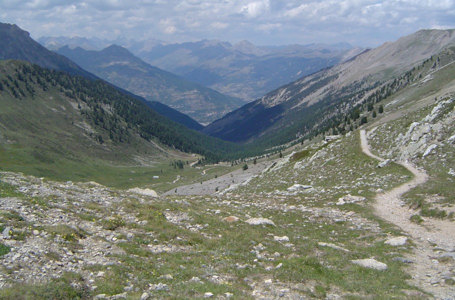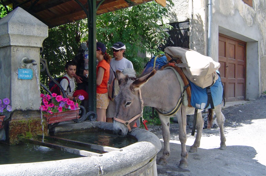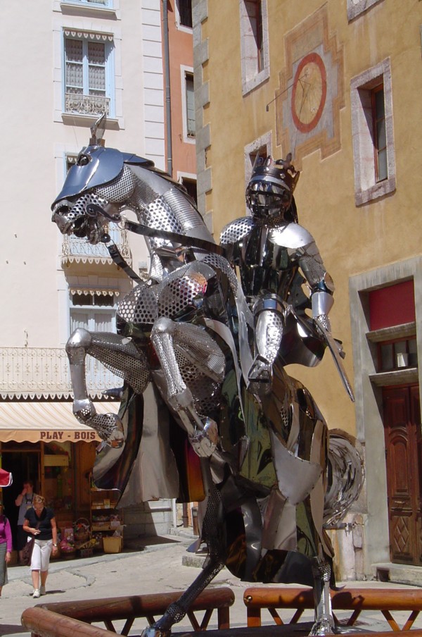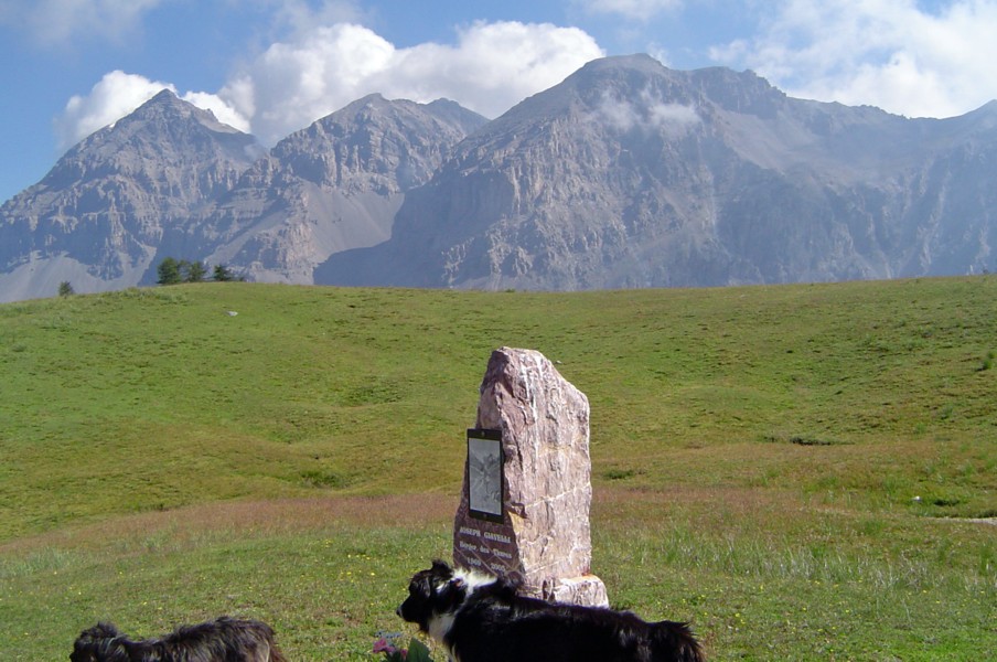 Bottom row L>R - modern statue, Briançon : walking into the Queyras : family with pack donkey at Chateau Queyras : eroded valley near Col du Fromage : saxifrage
