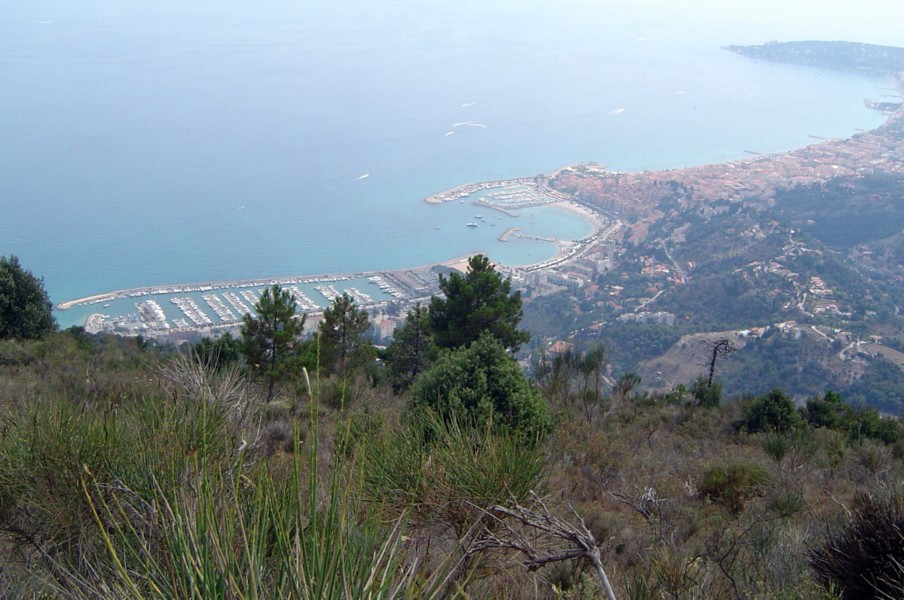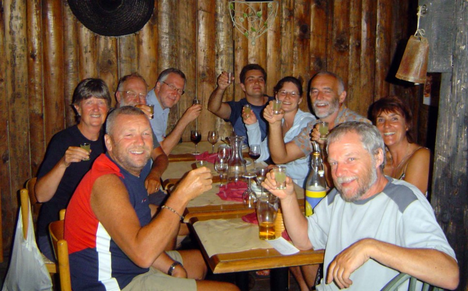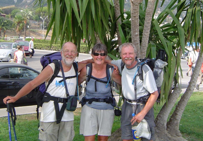 Bottom row L>R - prehistoric engraving in Vallée des Merveilles : Sospel : descent to Menton : Pete, Sue + Ivan at the finishing post! : the 'team' celebrate journey's end